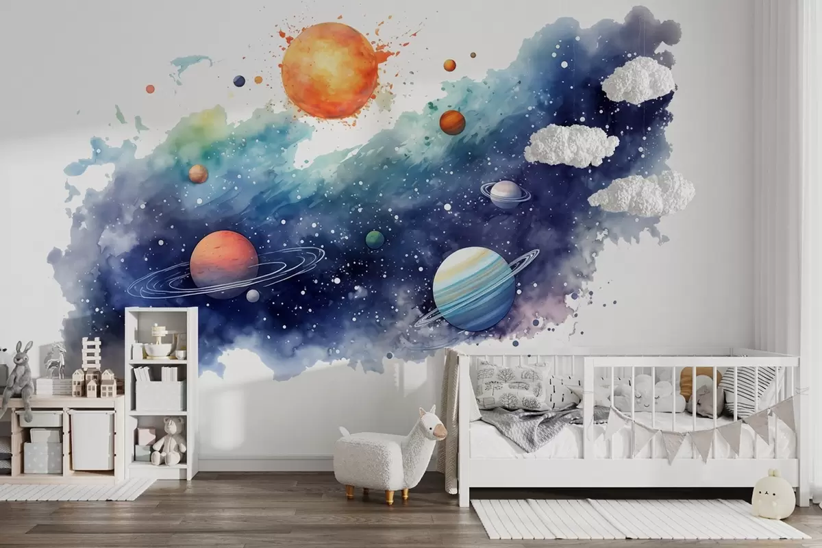 Papel tapiz Acuarela espacio, planetas, sol, estrellas Nr. w01803