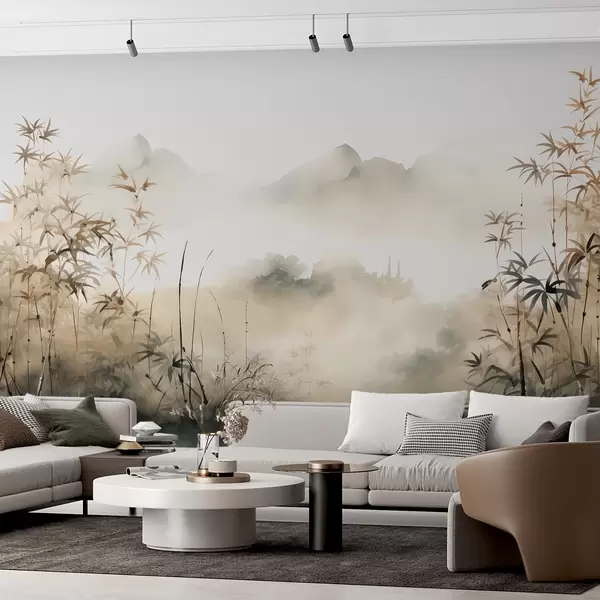 Papel tapiz Bambú junto al estanque con montañas en la niebla en el fondo acuarela húmeda Nr. w01862