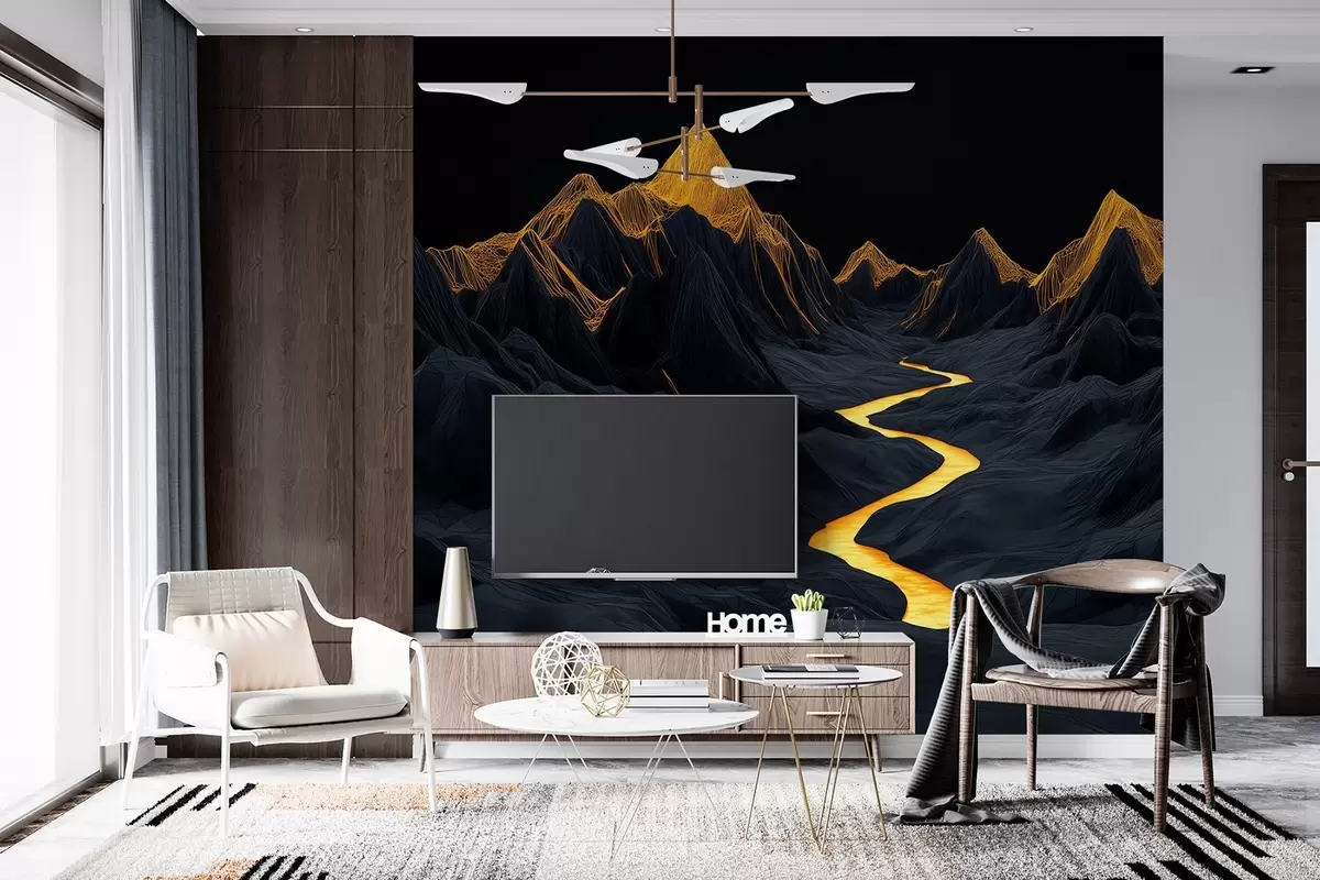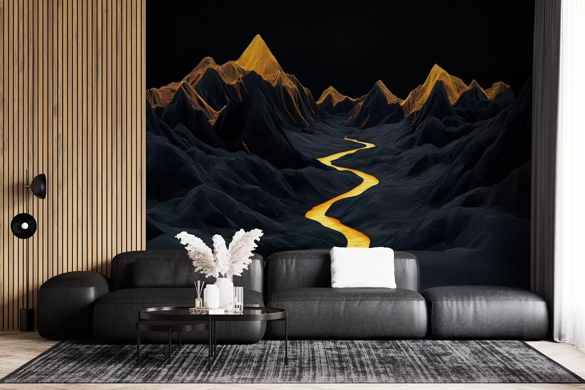 Papel tapiz Paisaje poligonal negro y un río entre las montañas Nr. w02063