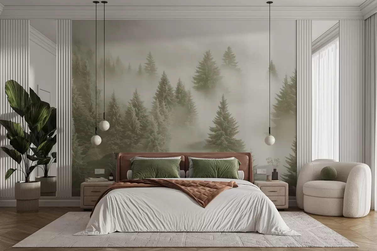 Papel tapiz Espesa niebla que envuelve un bosque nevado por la mañana en suaves tonos verdes Nr. w02064v2