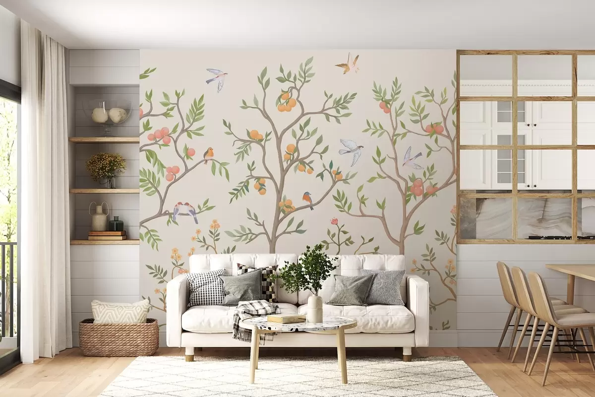 Papel tapiz Diseño Chinoiserie con pájaros, árboles sinuosos, frutas y flores Nr. w02128
