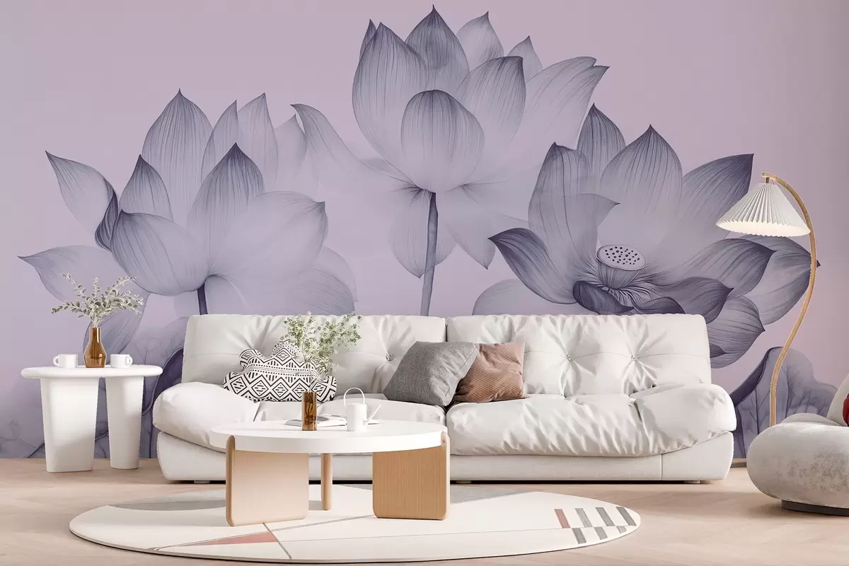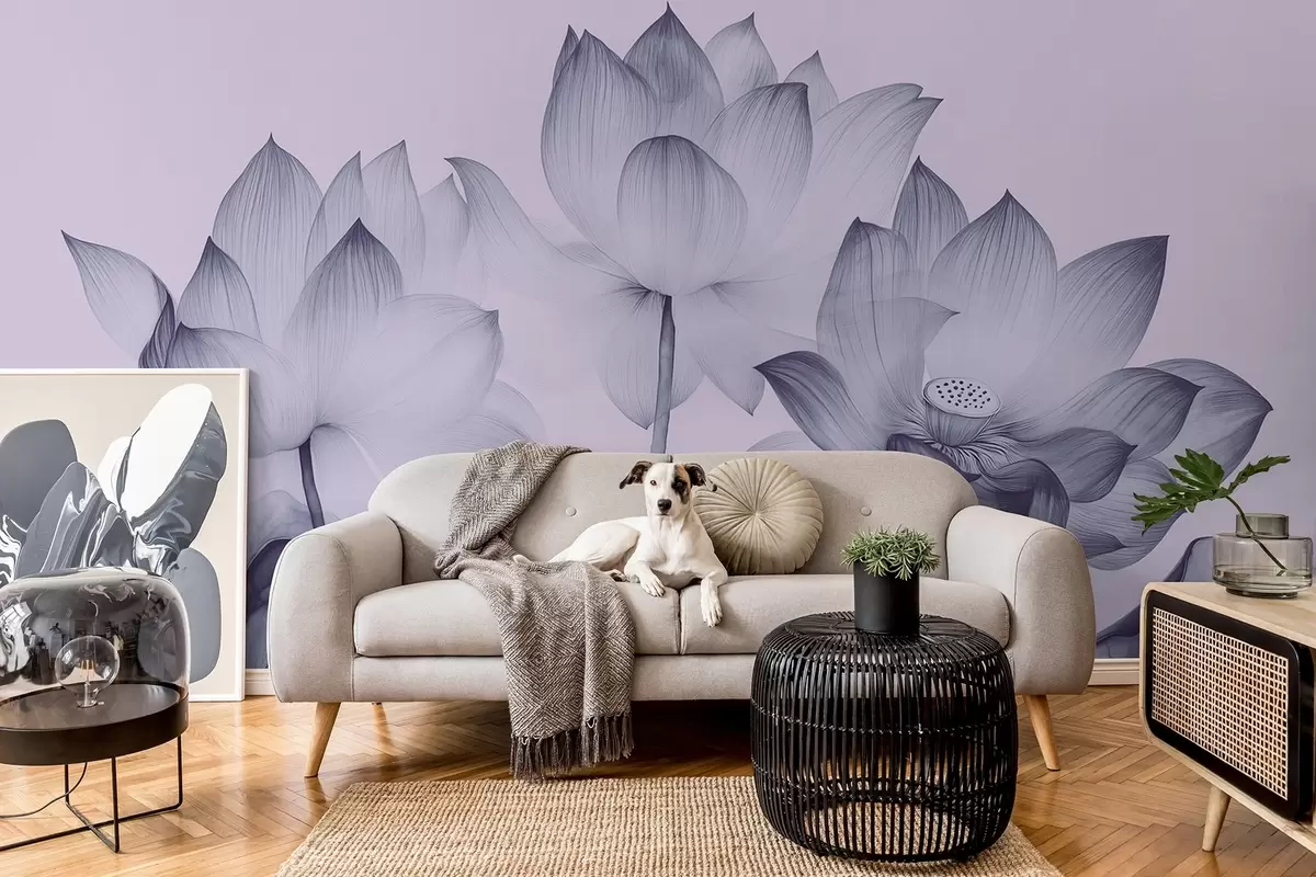 Papel tapiz Tres lotos con hojas al estilo de la pintura china en color azul Nr. w02146v2