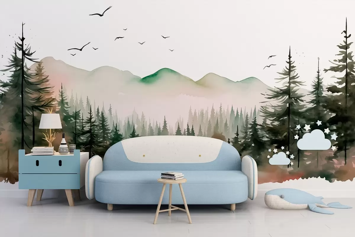 Papel tapiz Paisajes de bosque y montaña en acuarela, colores verde y rosa Nr. w02150v1