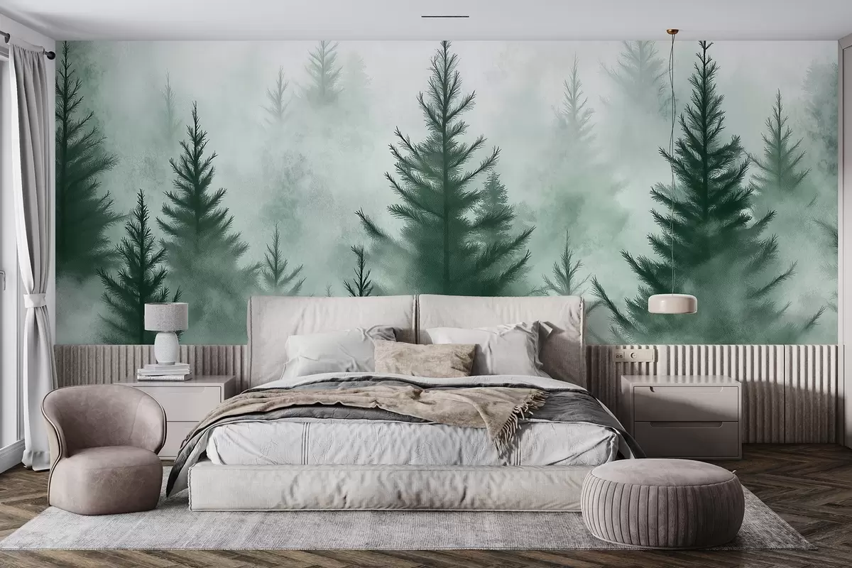 Papel tapiz Bosque en la niebla, pinos, acuarela, colores verdes Nr. w02152v1