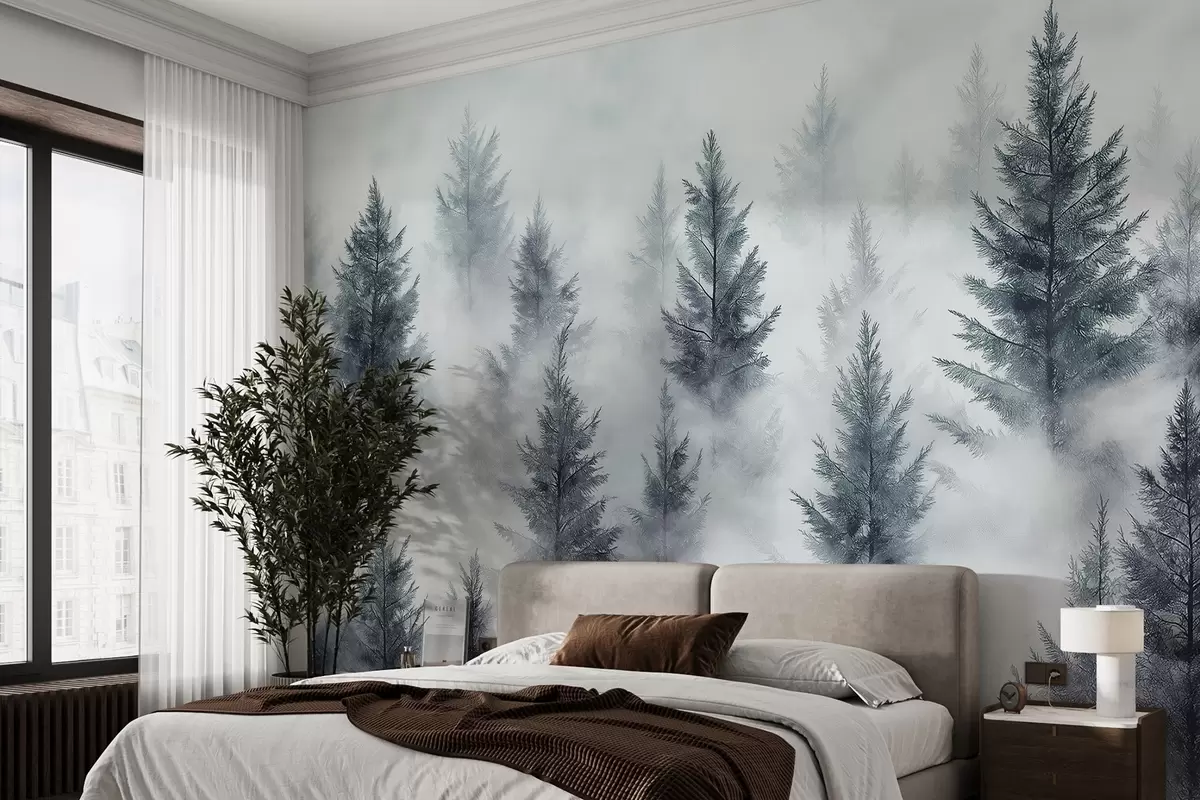 Papel tapiz Hermoso bosque con pinos, niebla, paisajes de naturaleza, colores grises Nr. w02222v2