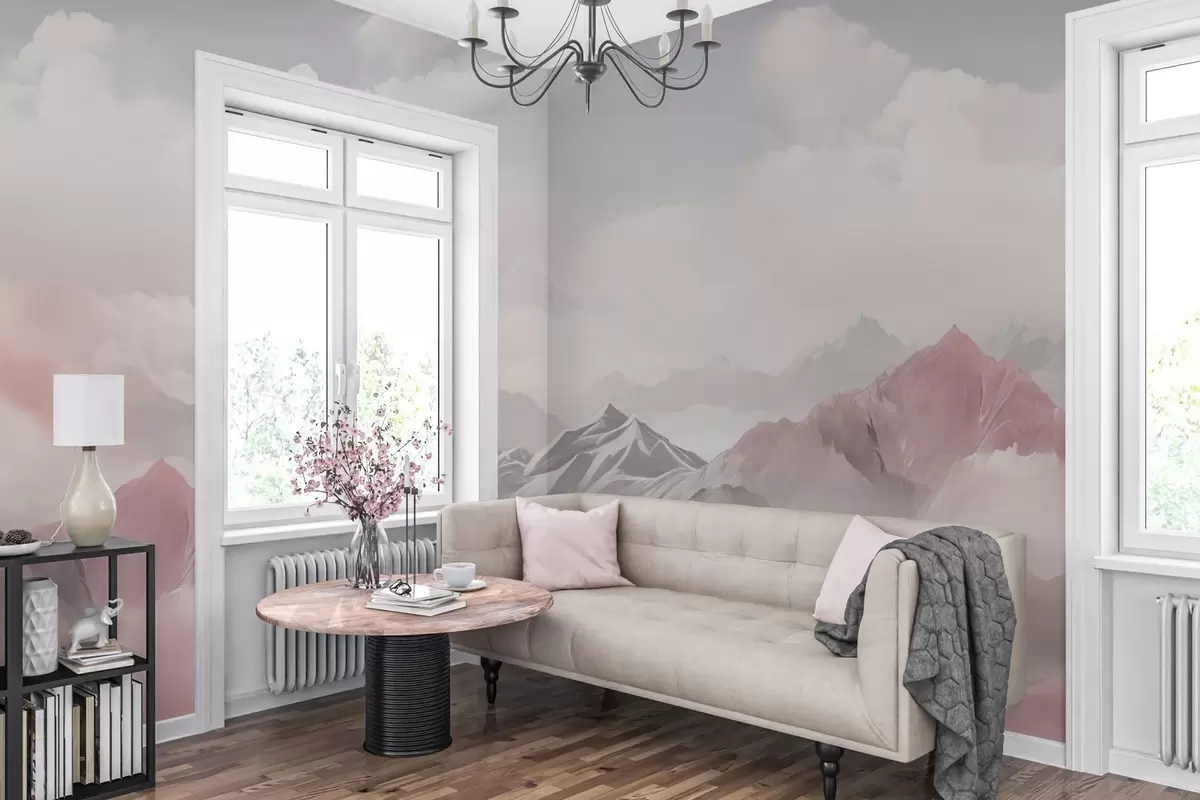 Papel tapiz Montañas rosadas entre niebla y nubes hinchadas Nr. w02296