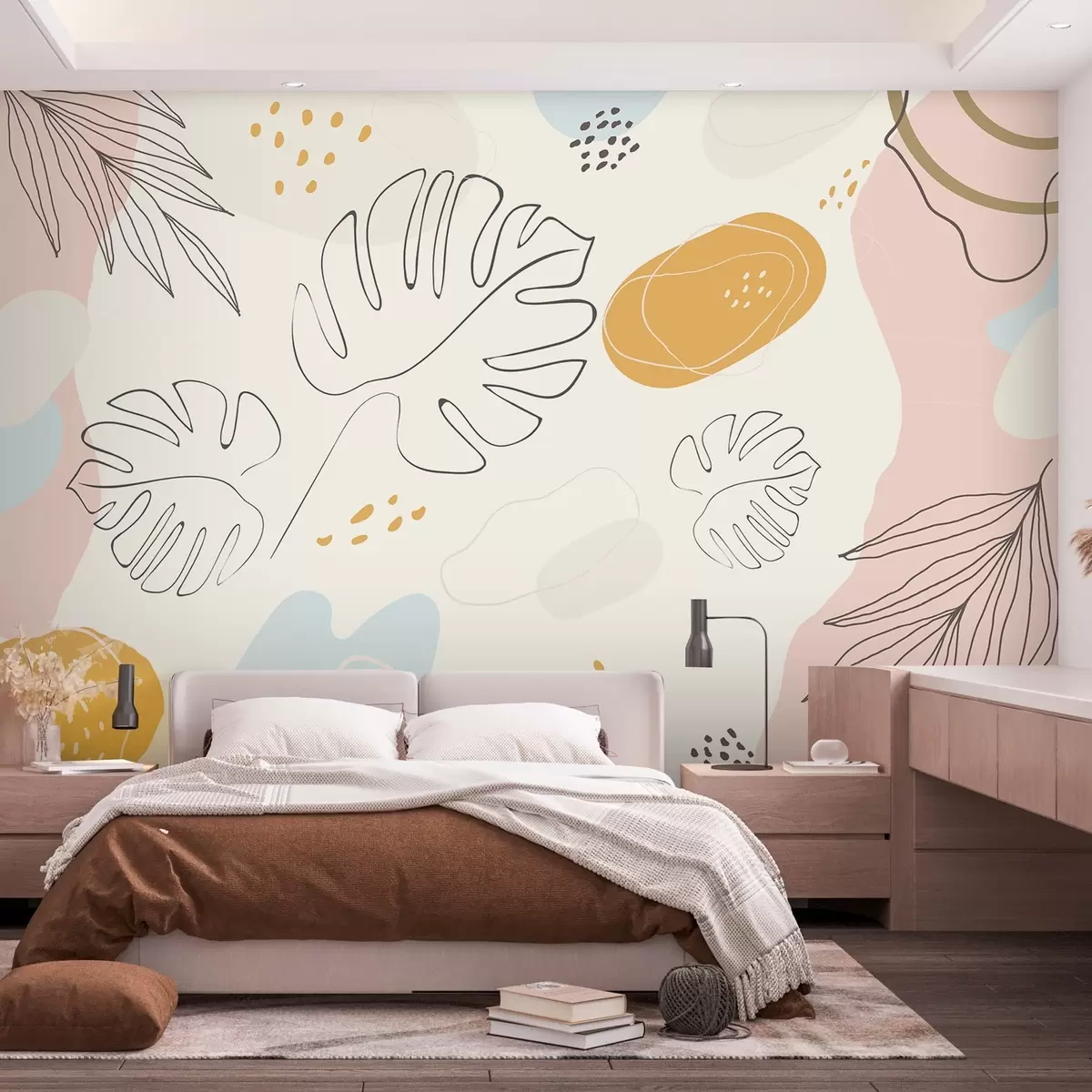 murales de pared Diseño boho con hojas y figuras en colores pastel w02322