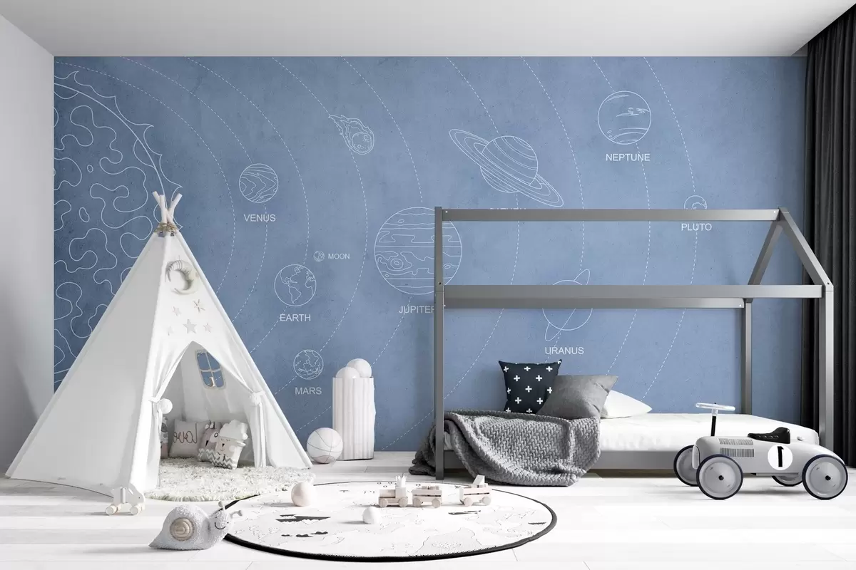 Papel tapiz Sistema solar en estilo minimalista sobre fondo azul texturado Nr. w02344v1