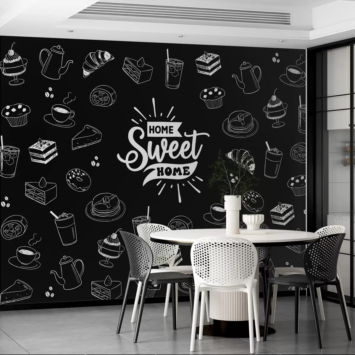 murales de pared papel pintado negro para la cocina con motivos blancos w02349