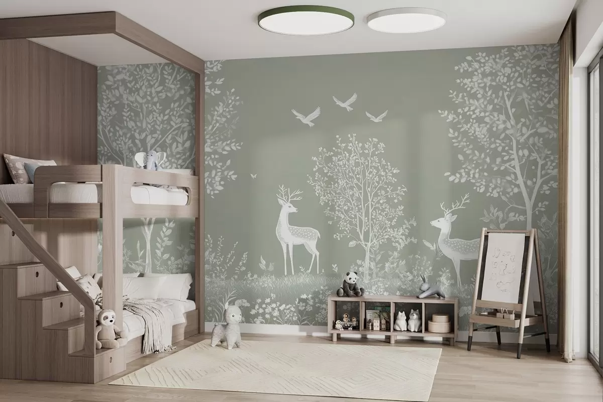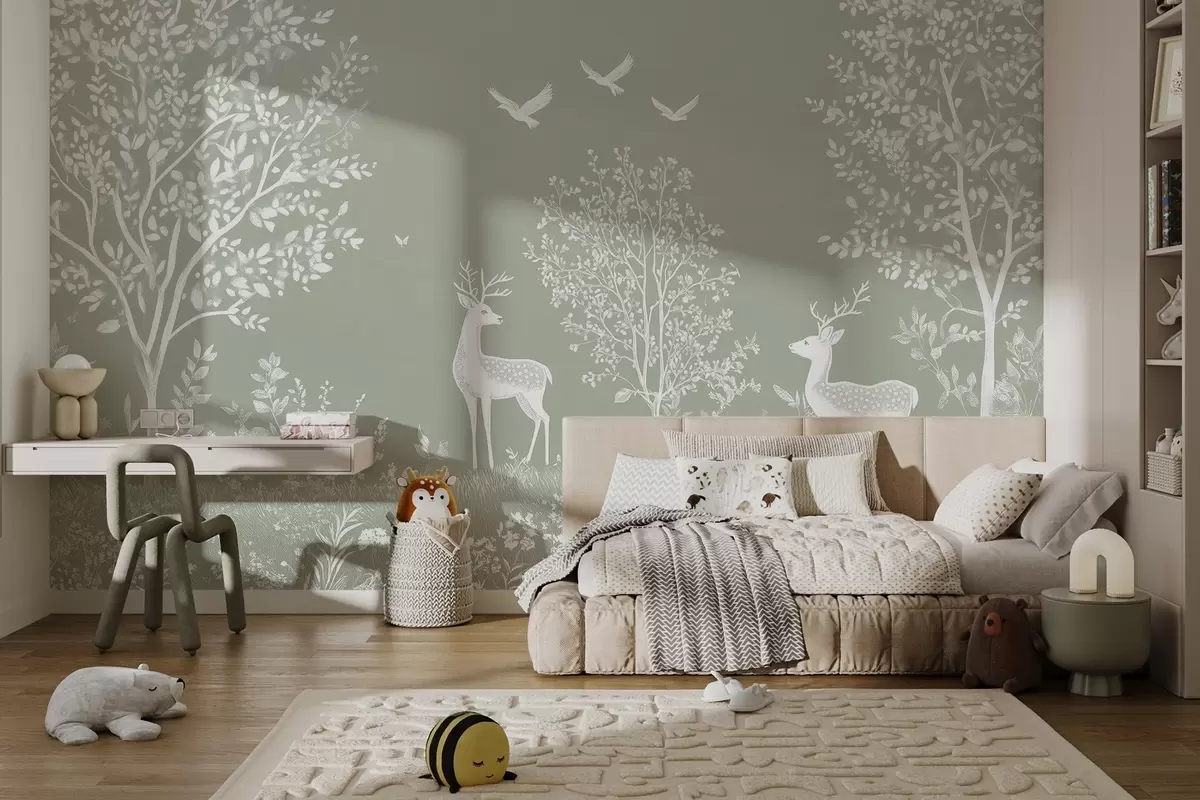 Papel tapiz bosque con ciervos en el estilo de un dibujo a la tiza sobre un fondo de oliva Nr. w02444v1