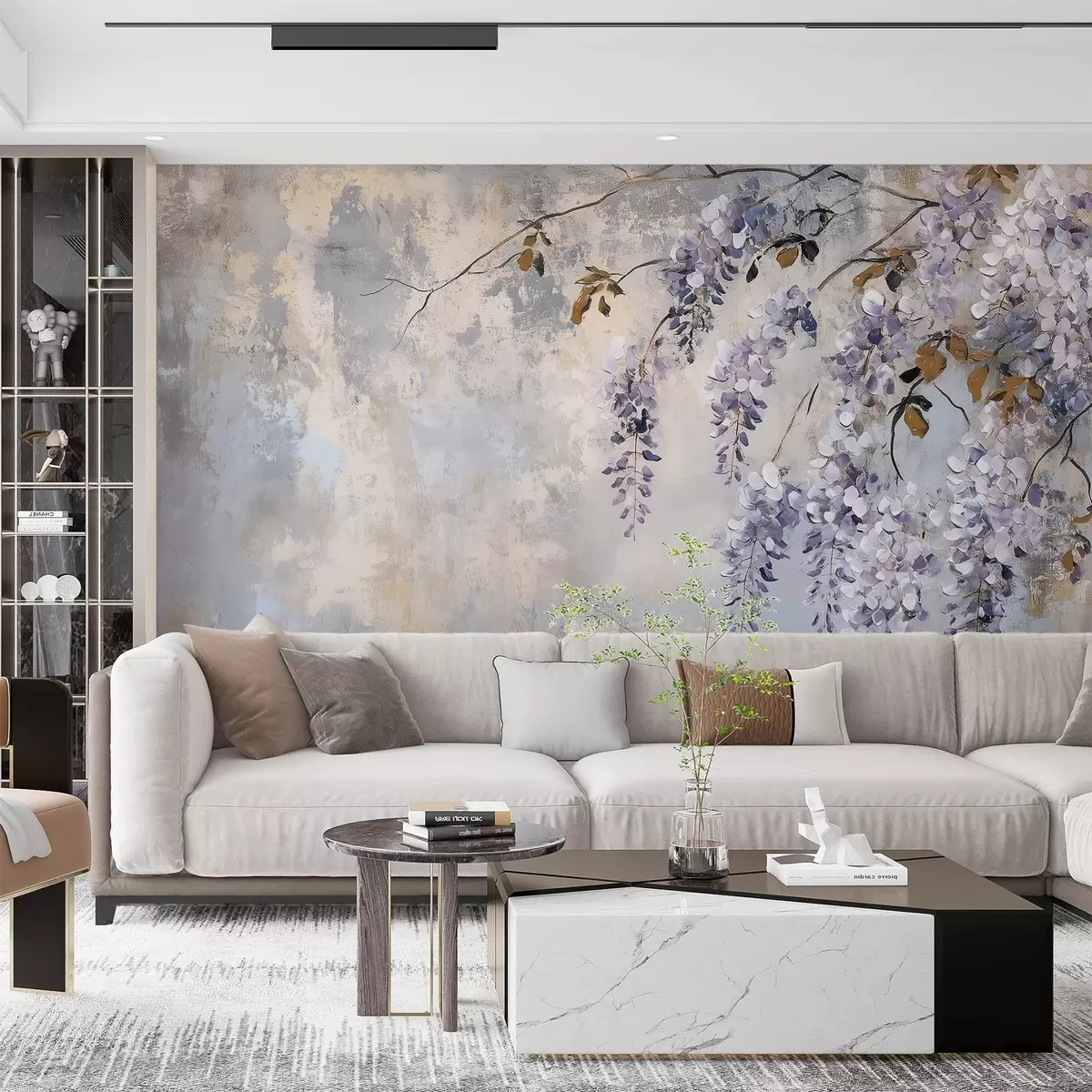 murales de pared papel pintado texturizado en colores suaves y apagados con delicadas flores y ramas de glicinia. w02451