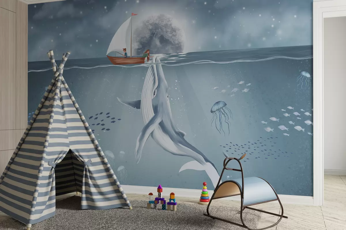 Papel tapiz Diseño infantil con ballena, luna y barco con niños Nr. w02476
