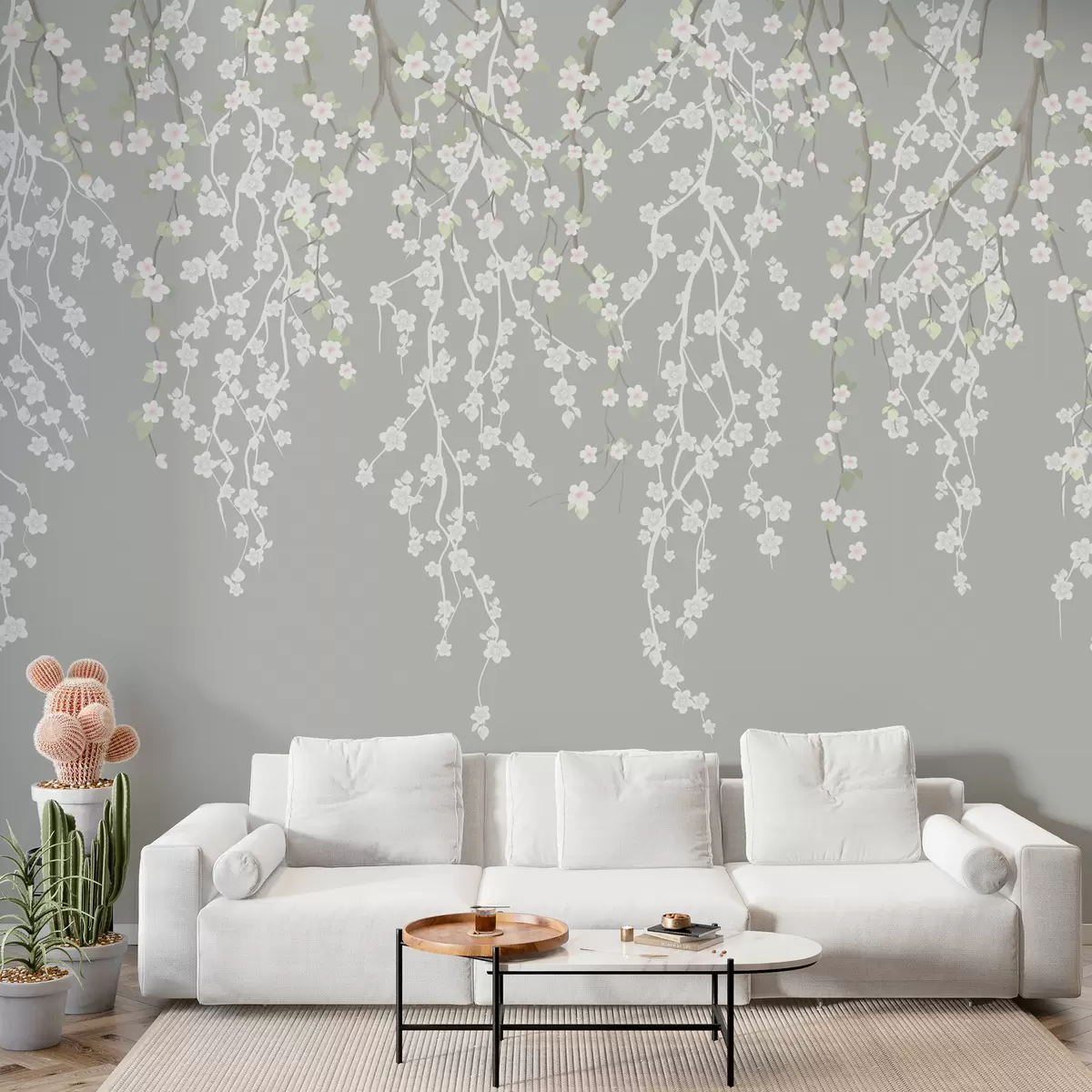 murales de pared Ramas delicadas con flores sobre fondo gris w02479v1