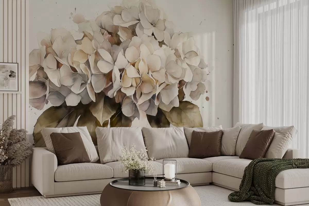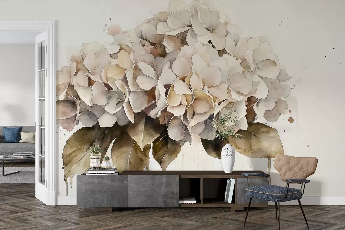 Papel tapiz Dibujo estilo acuarela de flor de hortensia, colores beige Nr. w02485