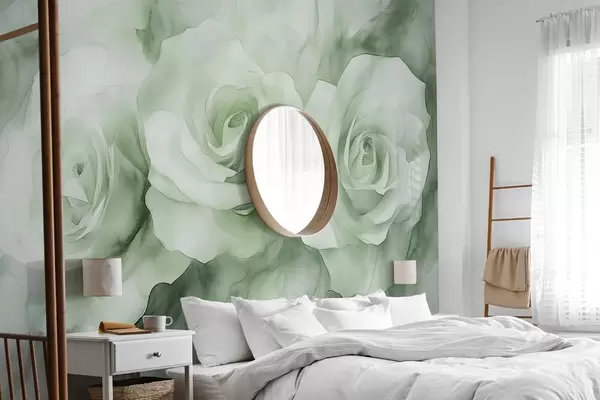 Papel tapiz Hermosas rosas, estilo acuarela, colores verdes, bohemio Nr. w02492v2