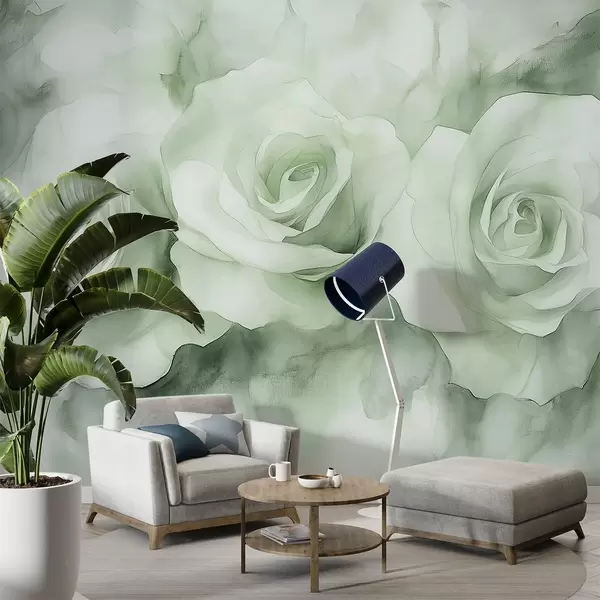 Papel tapiz Hermosas rosas, estilo acuarela, colores verdes, bohemio Nr. w02492v2