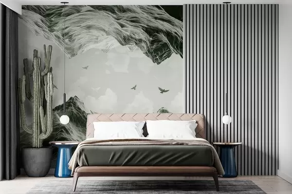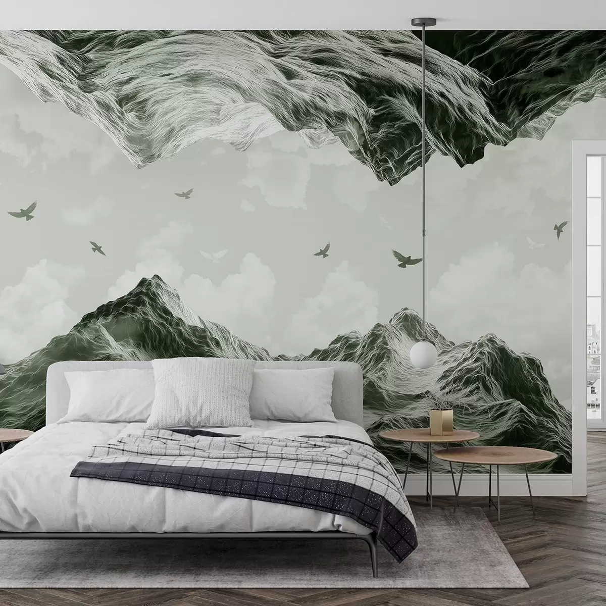 Papel tapiz Paisaje de montaña, realismo, pájaros volando, naturaleza, nubes, colores verdes Nr. w02514v3