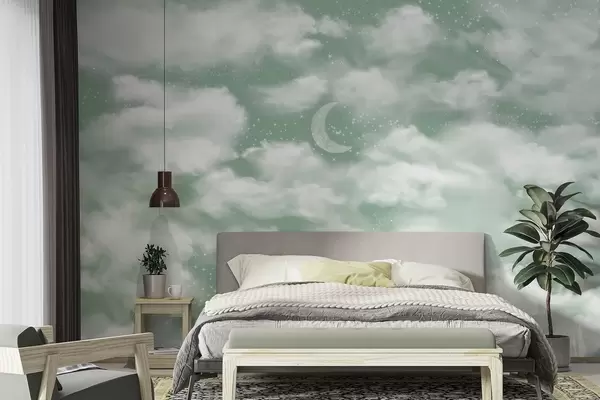 Papel tapiz Cielo estrellado con luna y nubes, soñador, etéreo, colores verdes suaves Nr. w02515v2