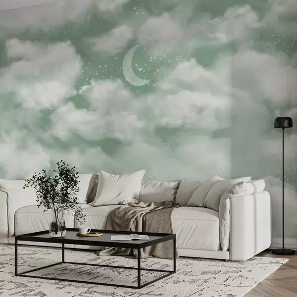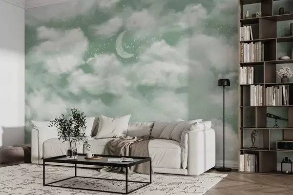 Papel tapiz Cielo estrellado con luna y nubes, soñador, etéreo, colores verdes suaves Nr. w02515v2