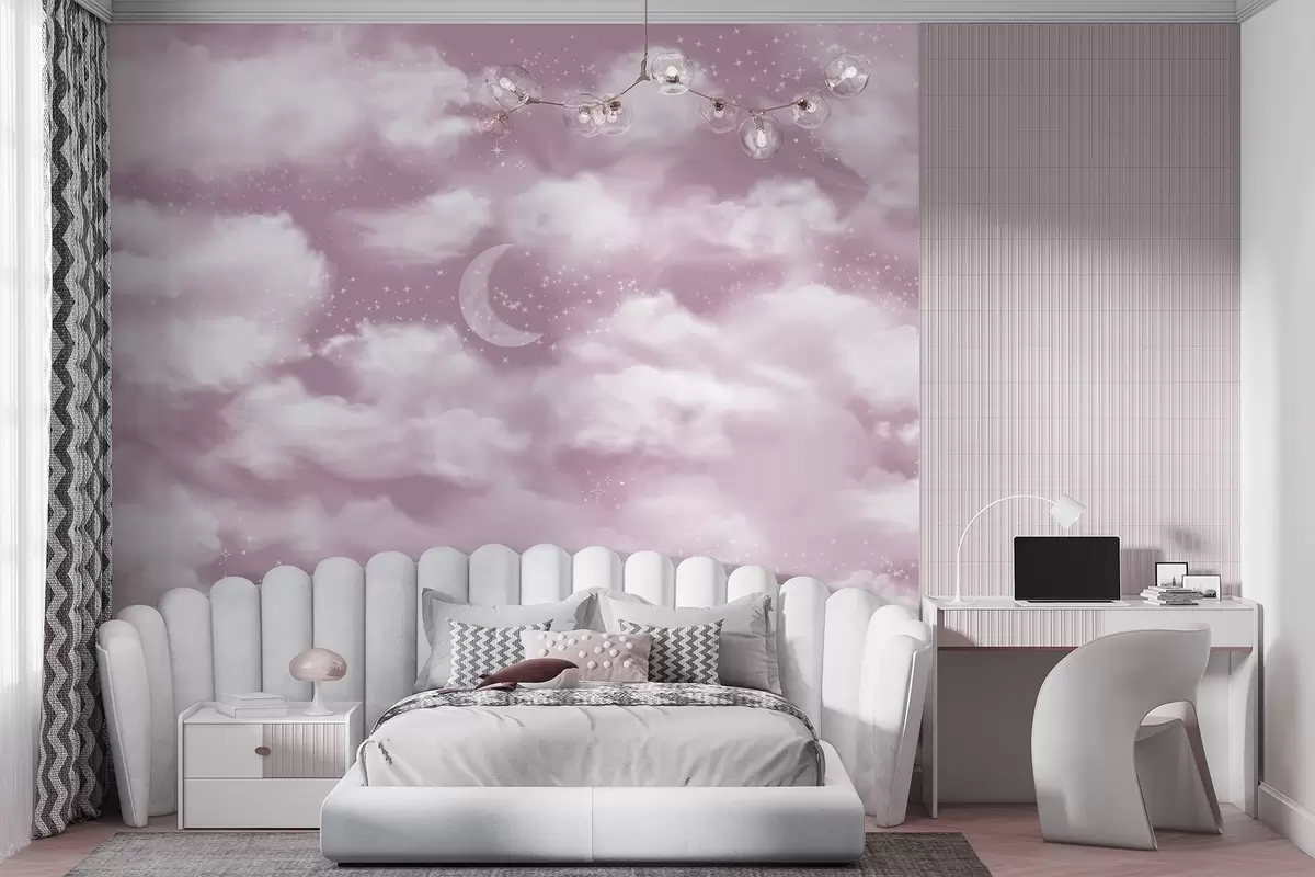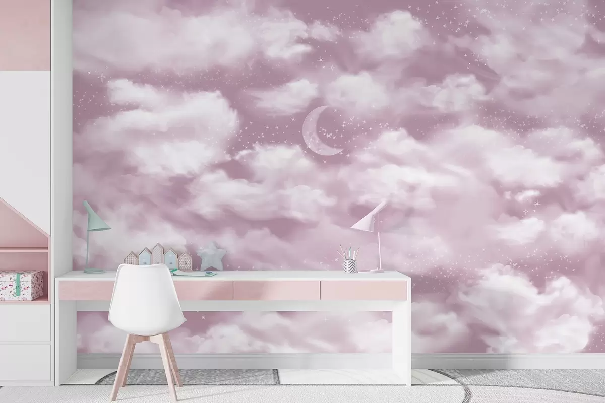 Papel tapiz Cielo estrellado con luna y nubes, de ensueño, etéreo, colores rosa suave Nr. w02515v3