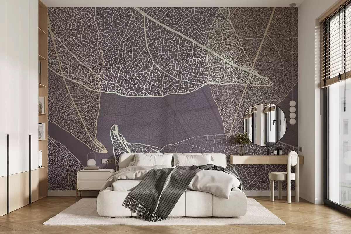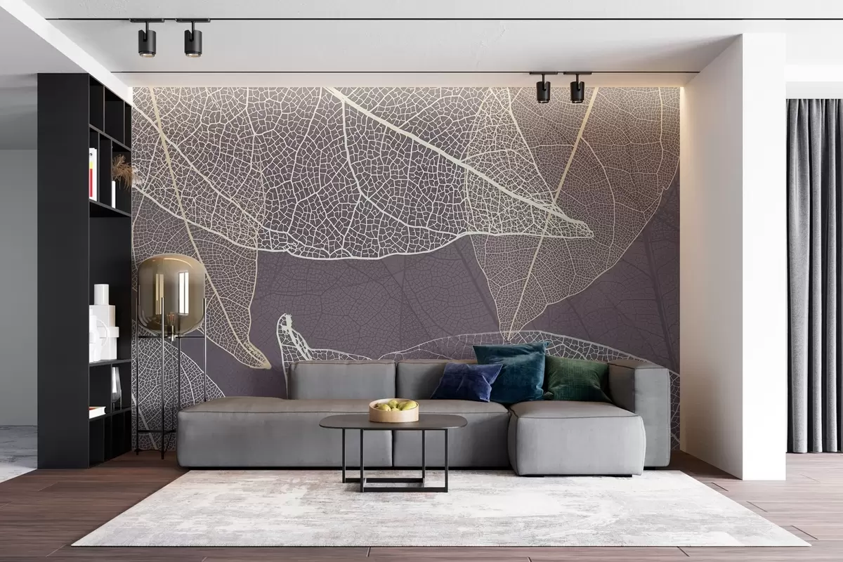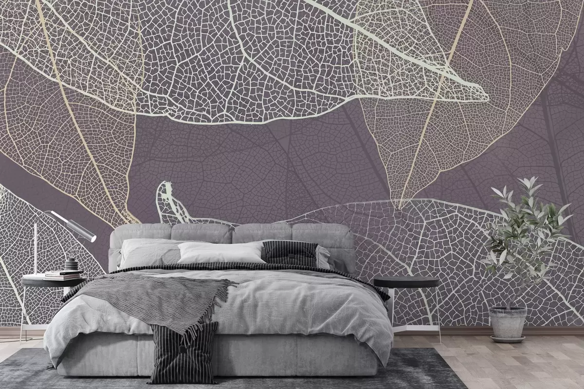 Papel tapiz primer plano de hojas con venas en tonos gris púrpura Nr. w02520v3