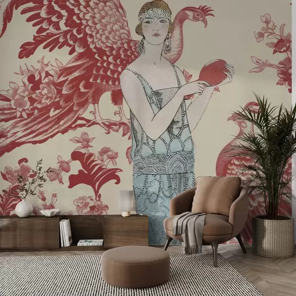 Papel tapiz Elegante motivo floral vintage con una mujer en tonos rojos Nr. w02532v1