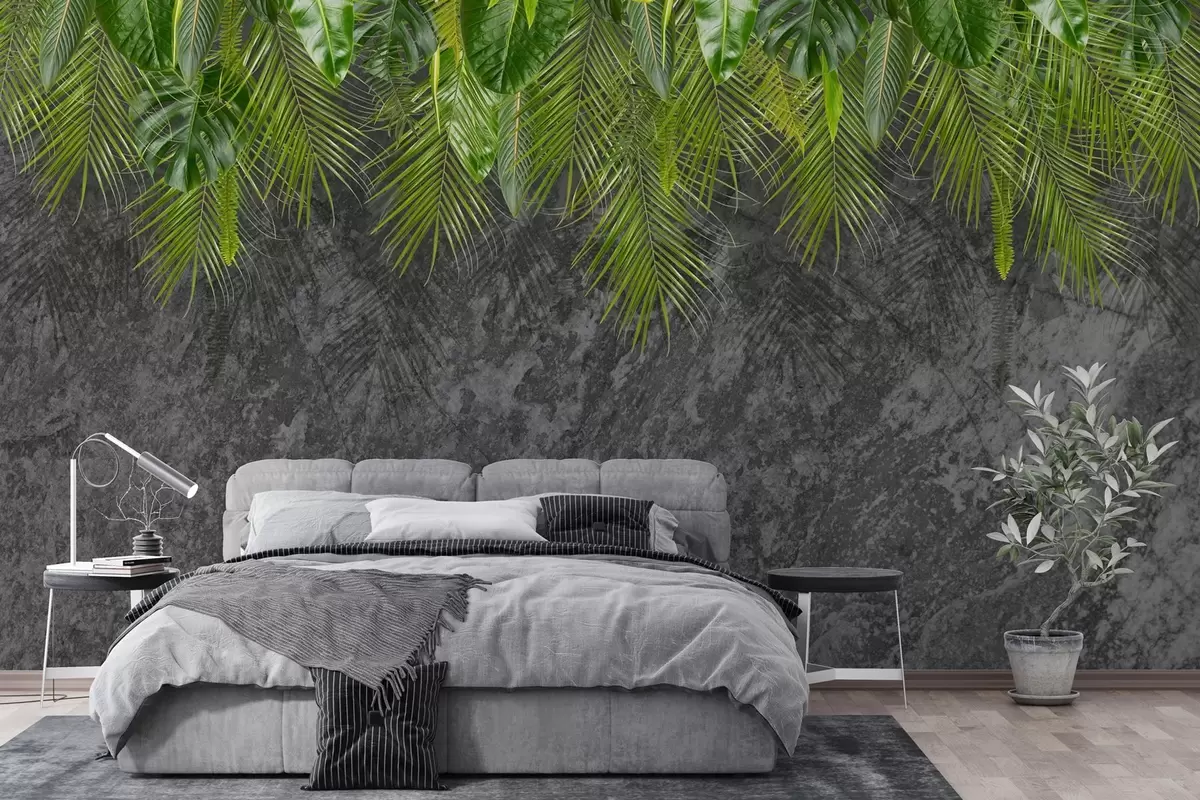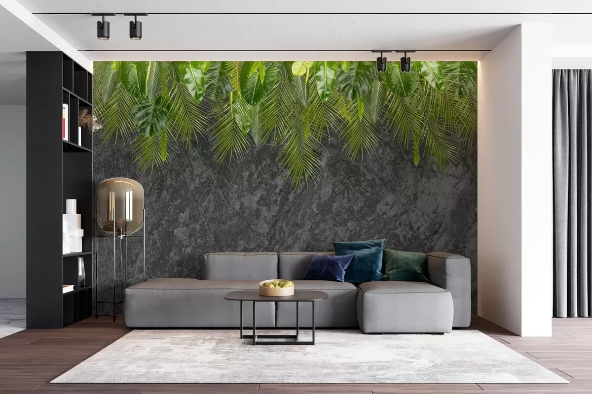 Papel tapiz hojas tropicales sobre fondo de imitación piedra Nr. w02547