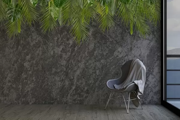 Papel tapiz hojas tropicales sobre fondo de imitación piedra Nr. w02547