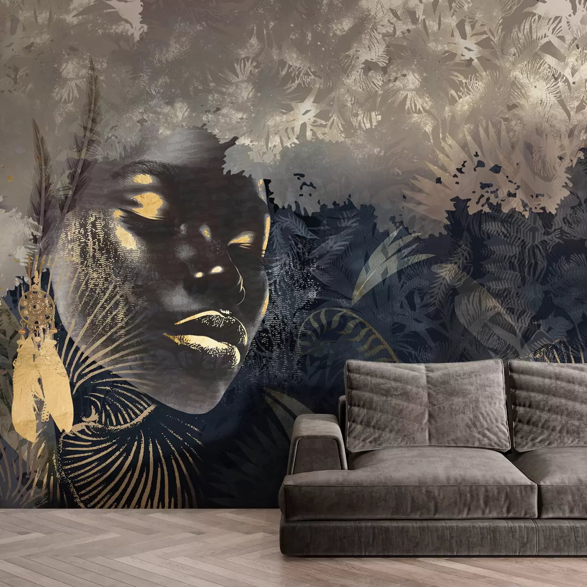 Papel tapiz África mágica con selva tropical, elementos femeninos y vectoriales con tinte azul Nr. w02642v1