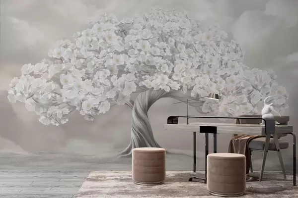 Papel tapiz Gran árbol florido con nubes de fondo en colores pastel Nr. w02748v1
