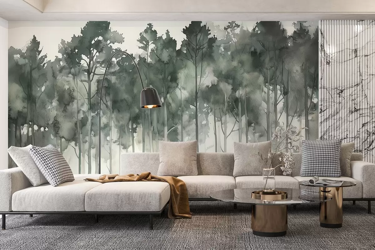 Papel tapiz Bosque estilo acuarela, pinos, paisaje natural, colores verdes Nr. w02937