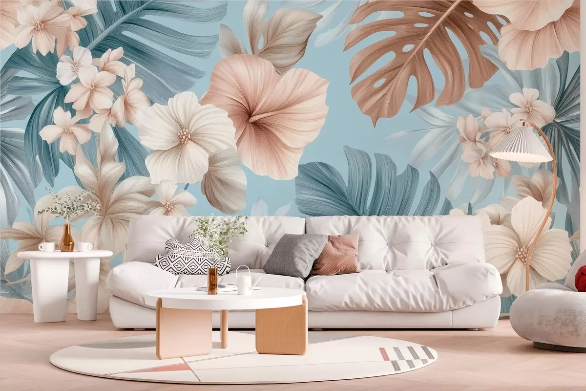Papel tapiz estampado tropical con grandes hojas y flores en tonos azul pastel y beige Nr. w03013