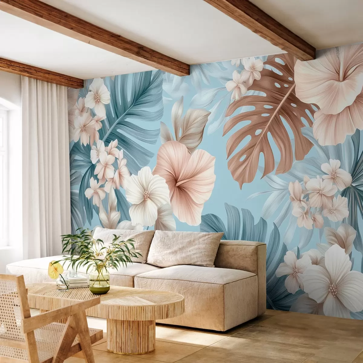 Papel tapiz estampado tropical con grandes hojas y flores en tonos azul pastel y beige Nr. w03013
