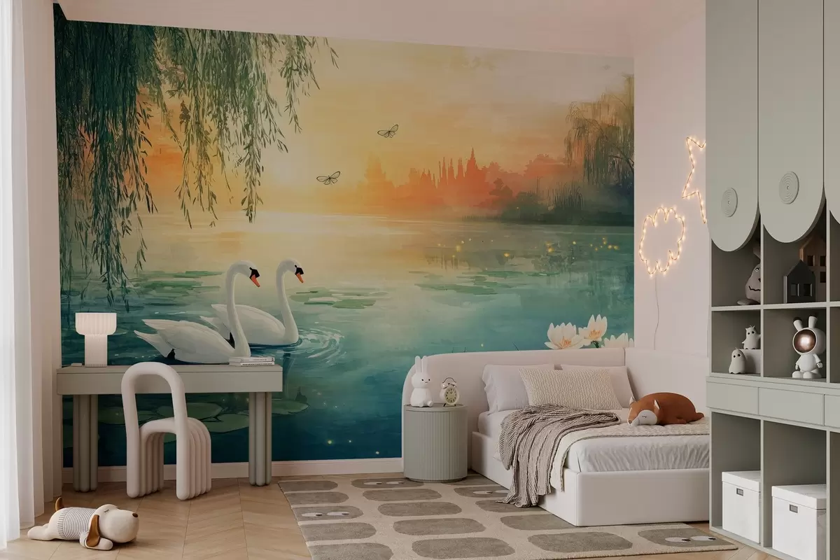 Papel tapiz Paisaje romántico al óleo con dos cisnes blancos en el lago Nr. w03017
