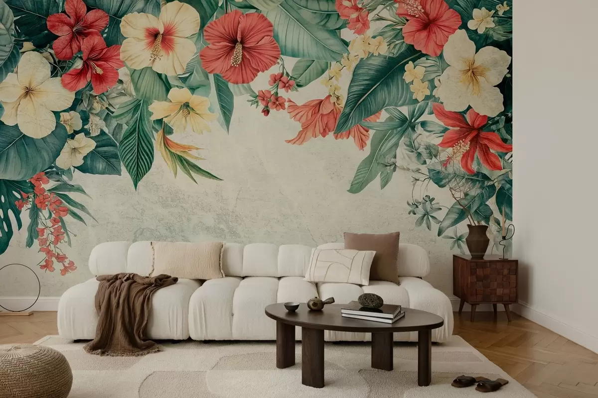 Papel tapiz flores y plantas tropicales colgando desde arriba sobre un fondo texturizado Nr. w03023