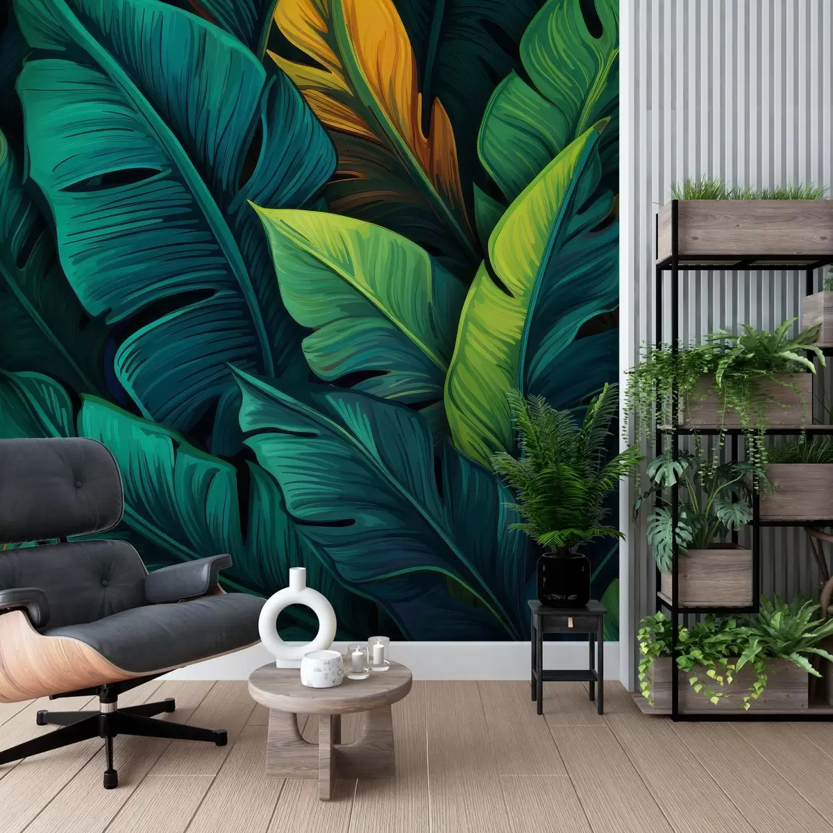 Papel tapiz Hojas tropicales vibrantes con tonalidades verde intenso, azuladas y anaranjadas Nr. w03078