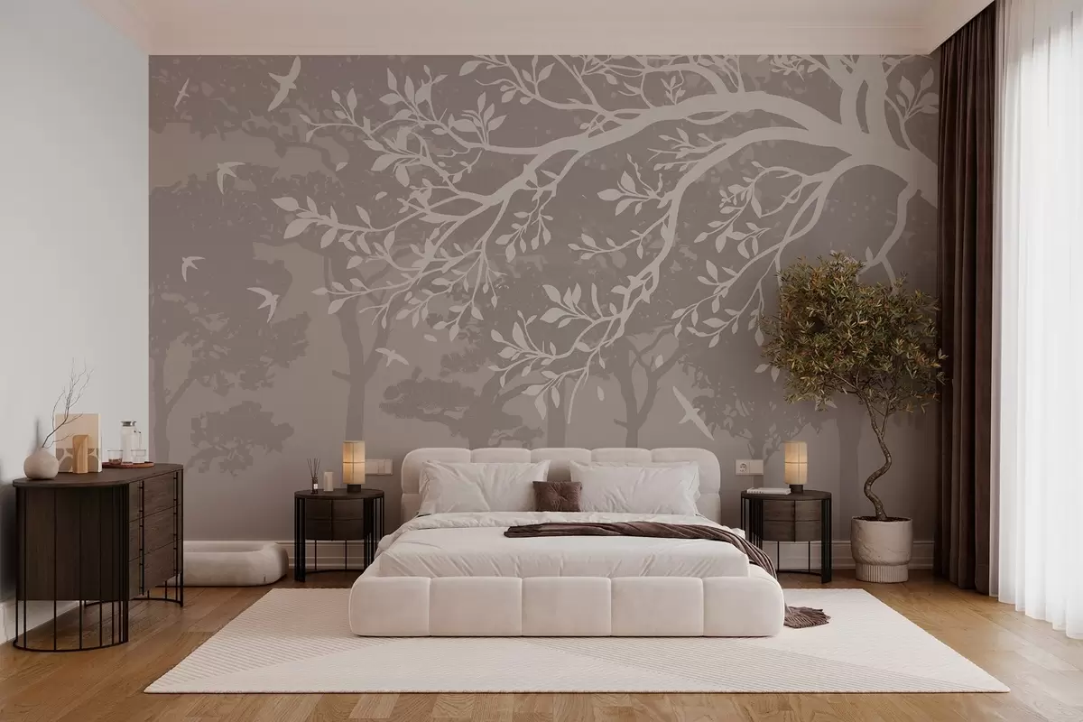 Papel tapiz silueta de una rama de árbol cremosa con pájaros, sobre el fondo del bosque Nr. w03116