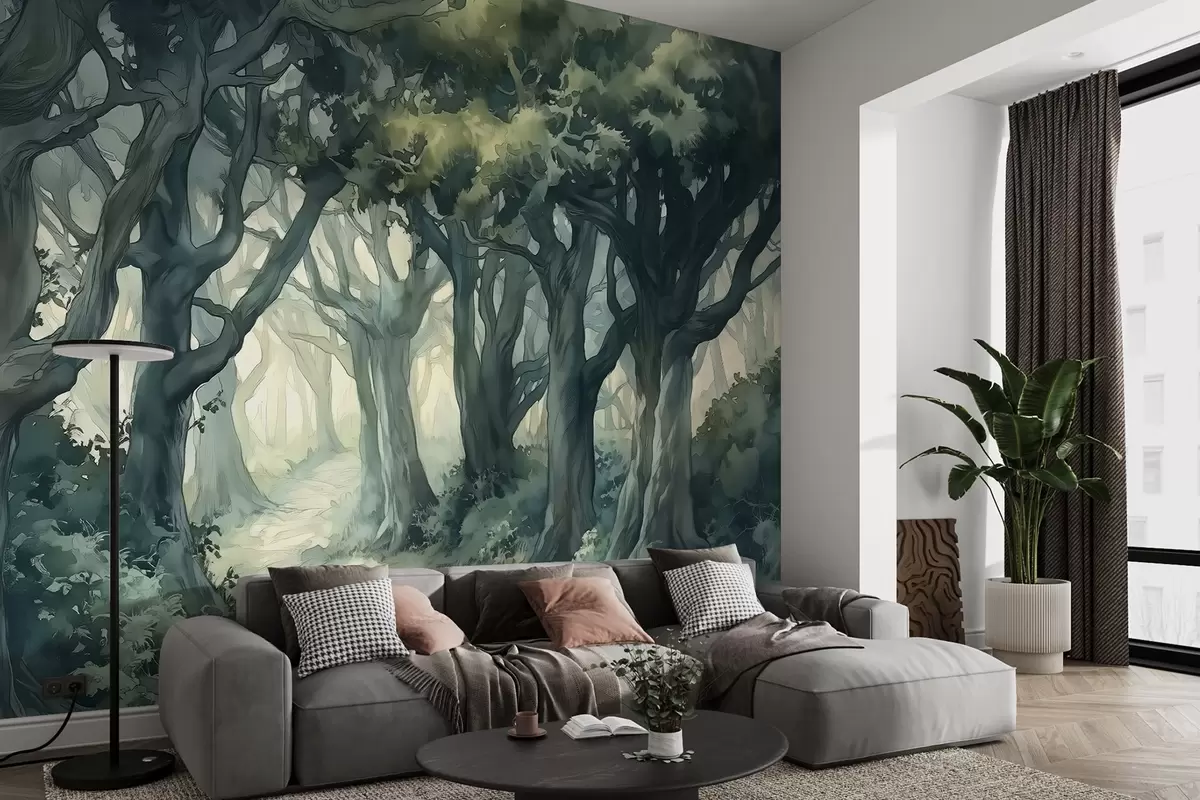 Papel tapiz Bosque con árboles grandes, spallete color verde, dibujo estilo acuarela Nr. w03150