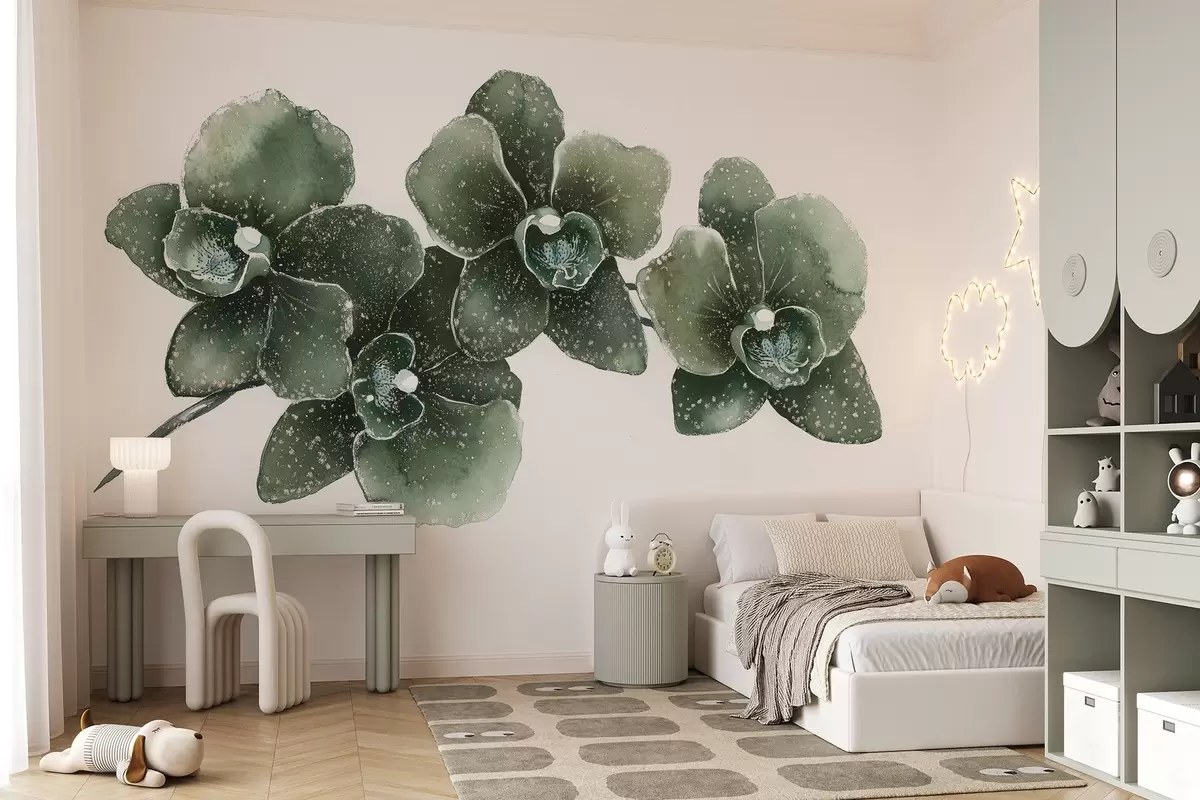 murales de pared Rama de flor de Orhid, estilo acuarela, floral, colores verdes w03165v1