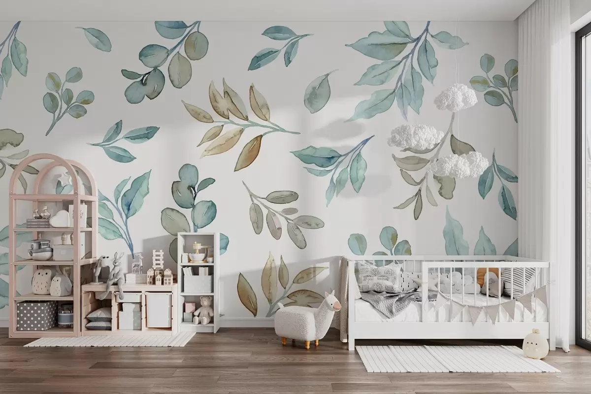 Papel tapiz varias hojas y ramas en técnica de acuarela en tonos azules y beige sobre fondo blanco Nr. w03280