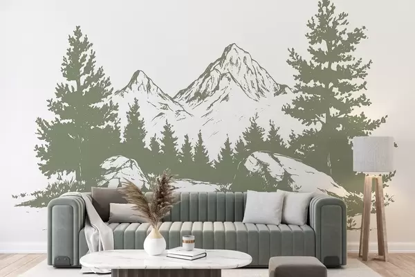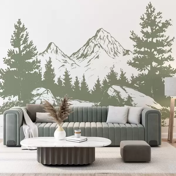 Papel tapiz Los Alpes, montañas con bosque, dibujo lineal, color verde Nr. w03342v1