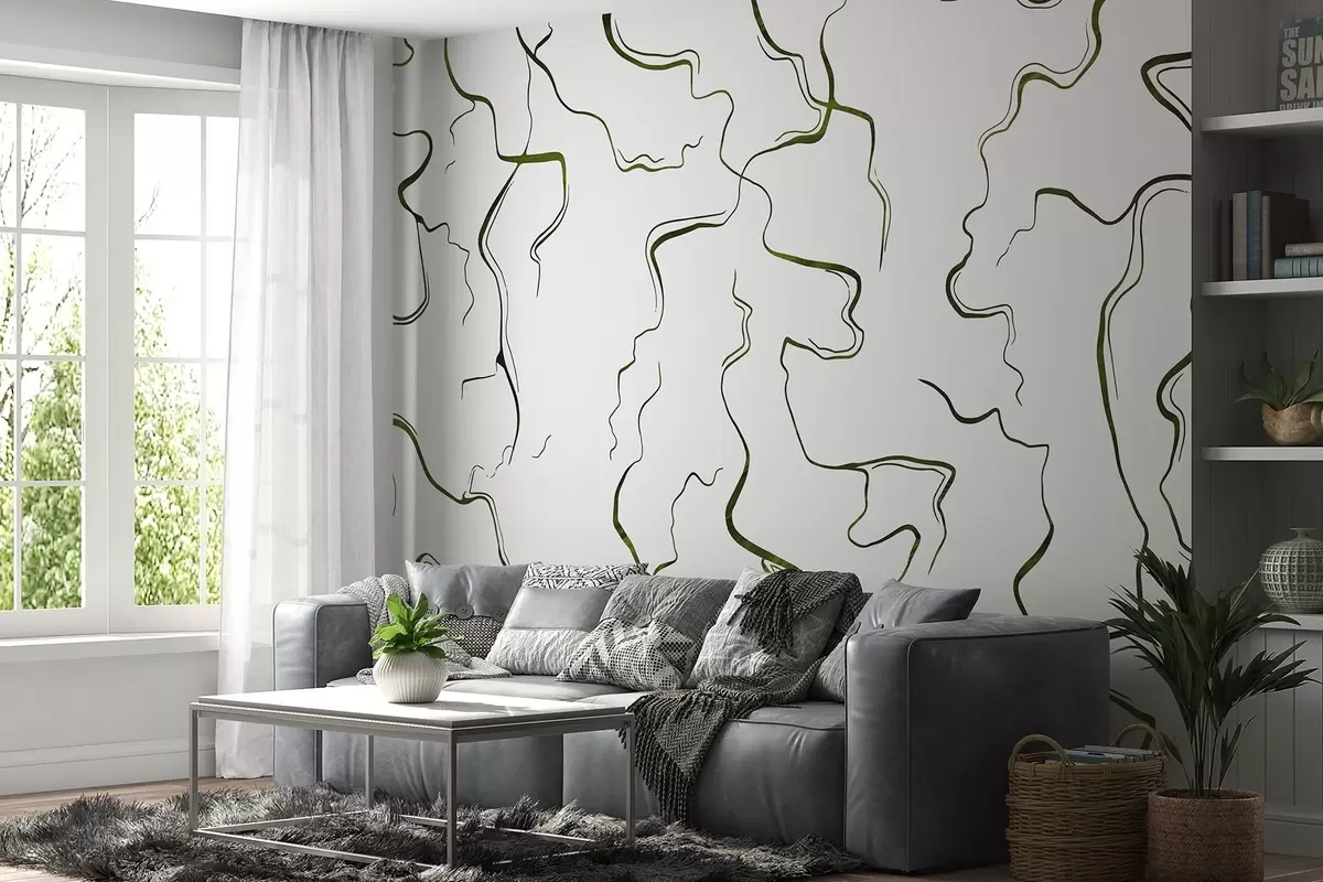 murales de pared Líneas geométricas, estilo tinta, abstracción, colores verdes w03436