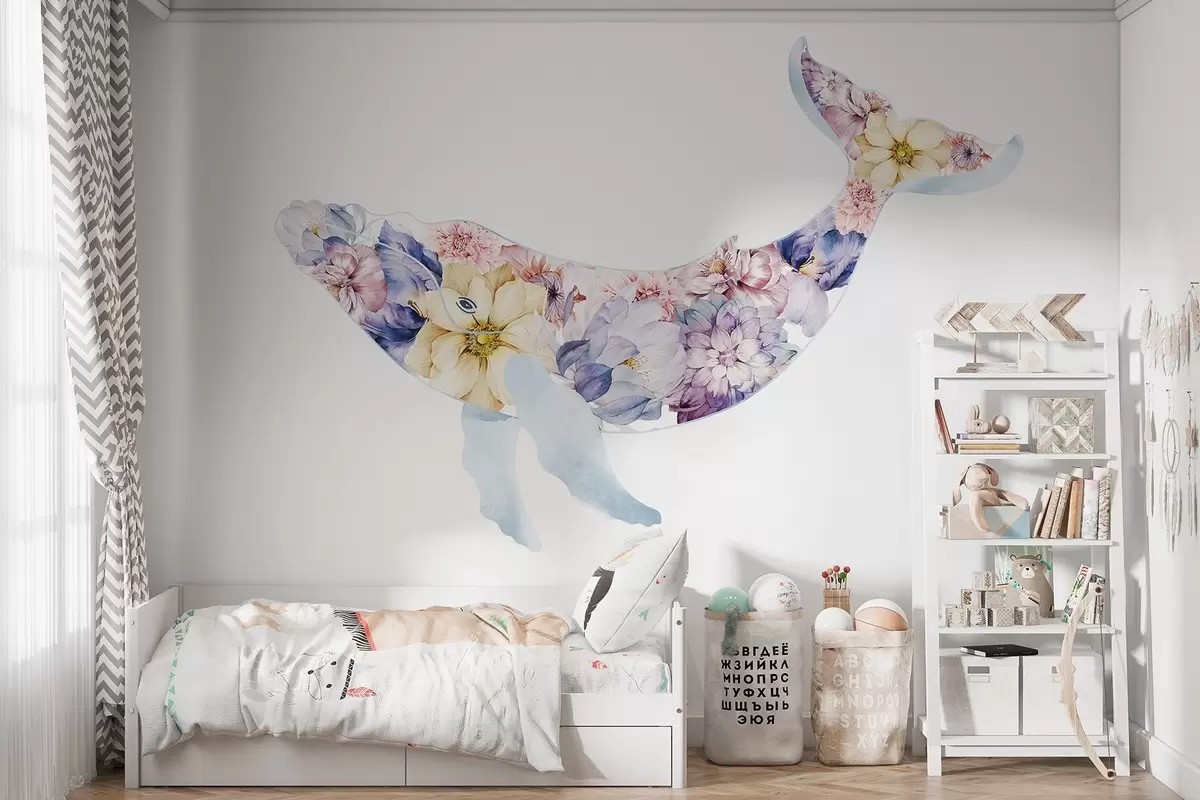 Papel tapiz Hermosa ballena con flores de acuarela, animales marinos, colorido Nr. w03445