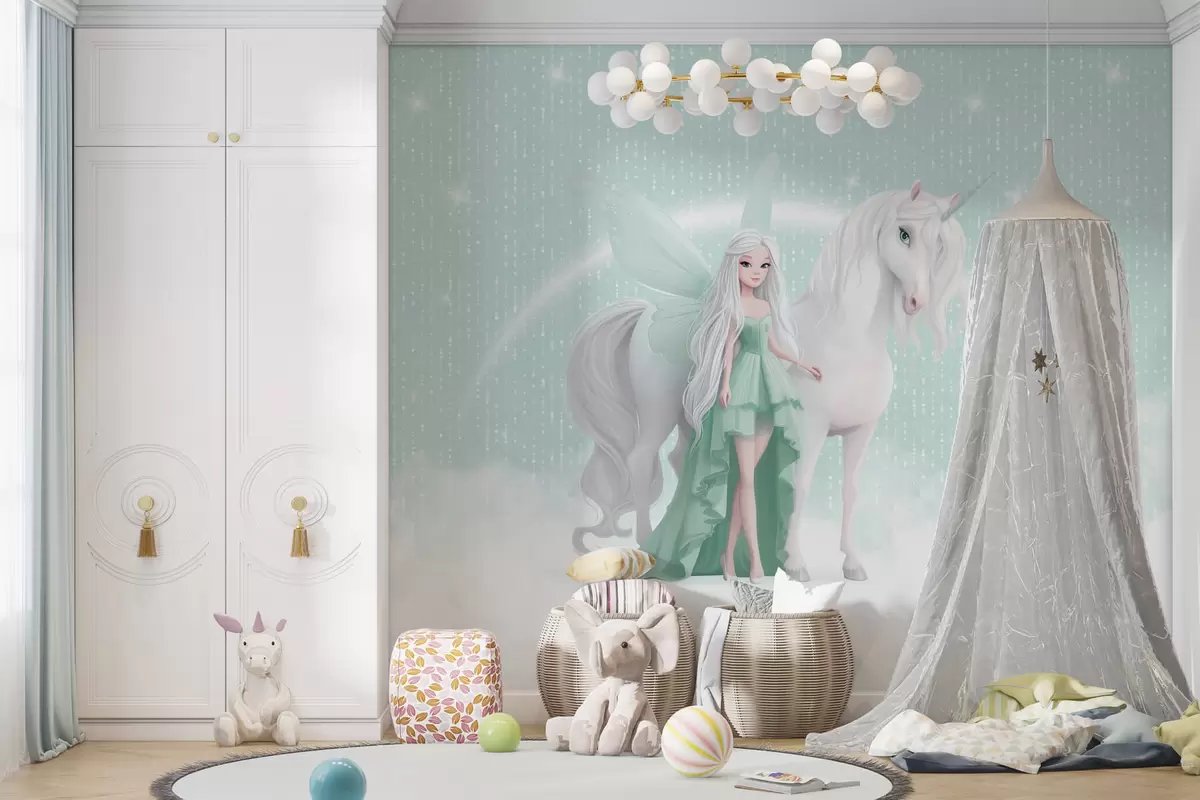 Papel tapiz Un hada con un unicornio entre las nubes Nr. w03527v2