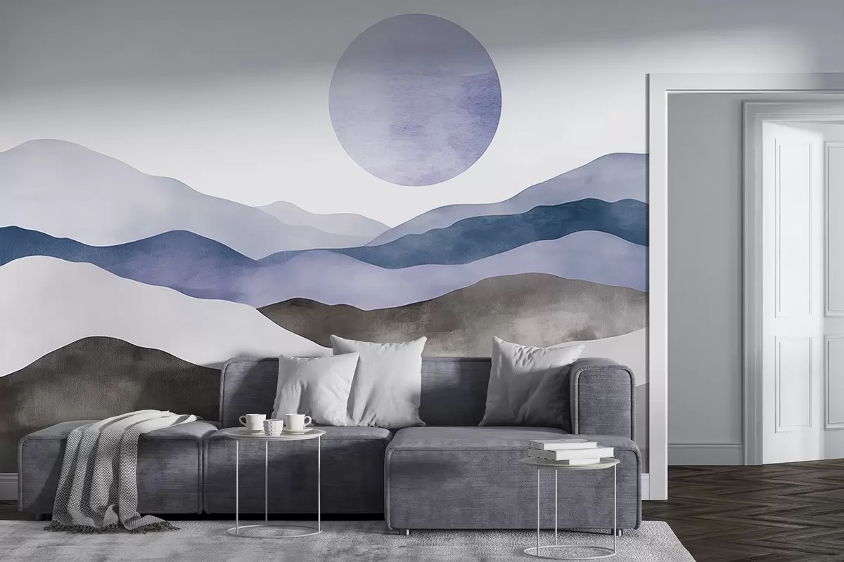Papel tapiz Acuarela montañas con el sol, estilo boho, púrpura, azul, gris Nr. w03551v1