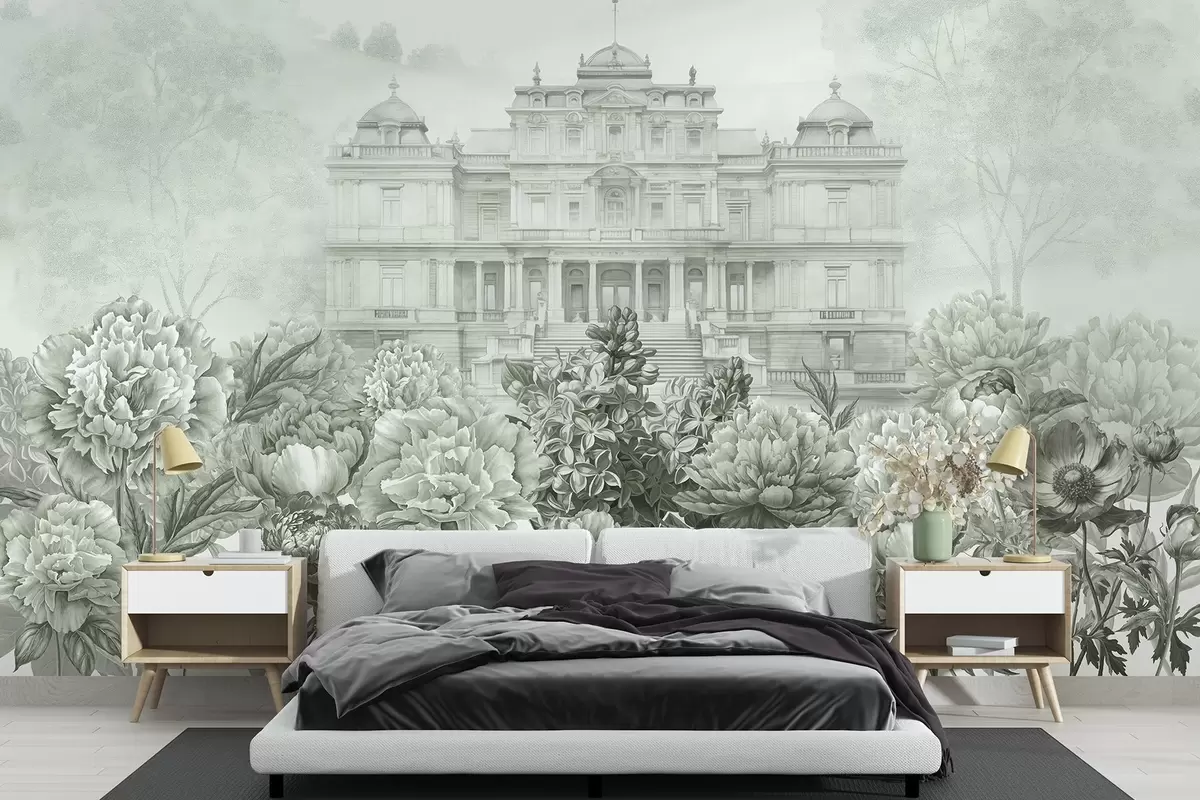 Papel tapiz Palacio real con jardín de peonías, estilo acuarela, naturaleza, colores verdes, boho Nr. w03552v2