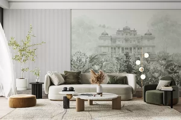 murales de pared Palacio real con jardín de peonías, estilo acuarela, naturaleza, colores verdes, boho w03552v2