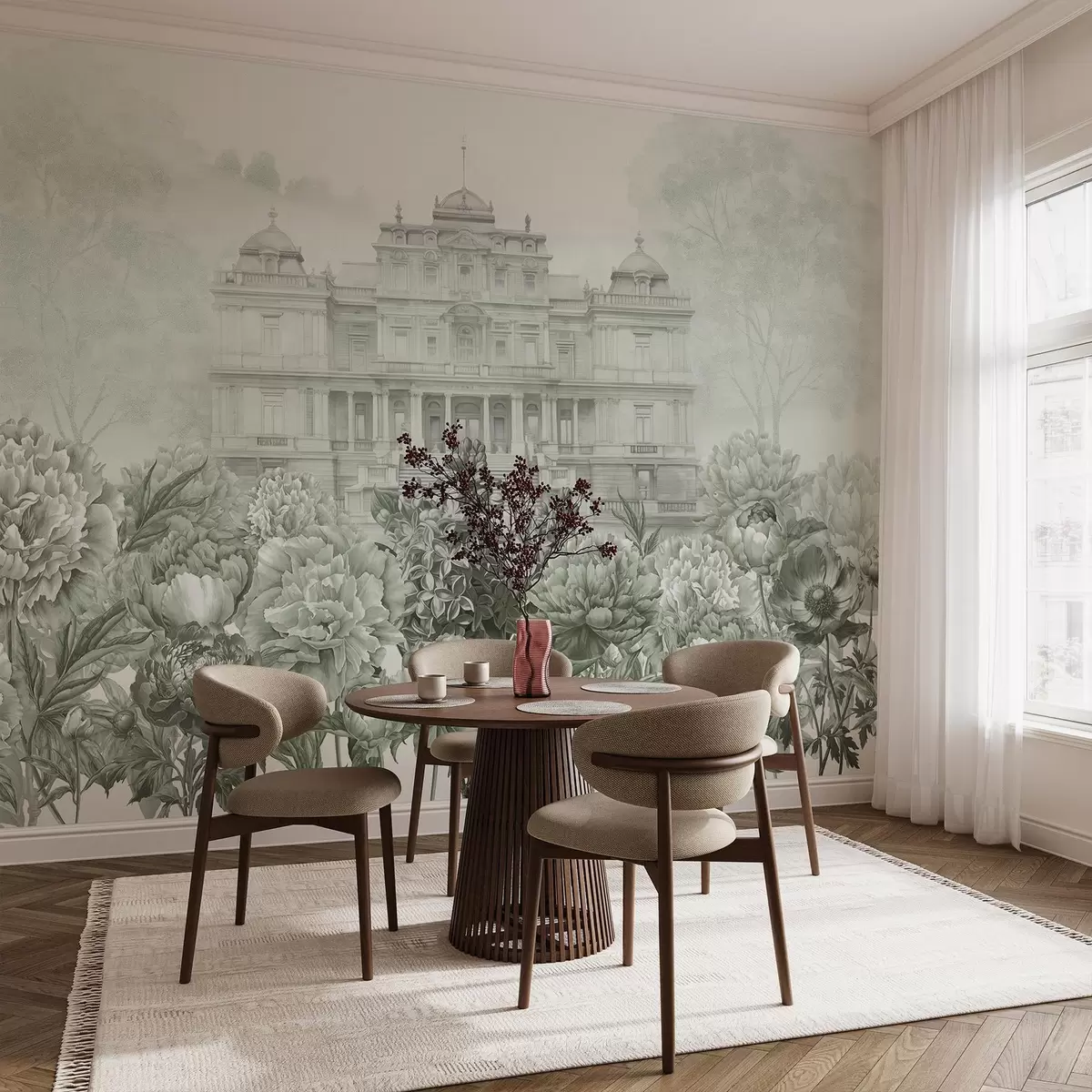 Papel tapiz Palacio real con jardín de peonías, estilo acuarela, naturaleza, colores verdes, boho Nr. w03552v2