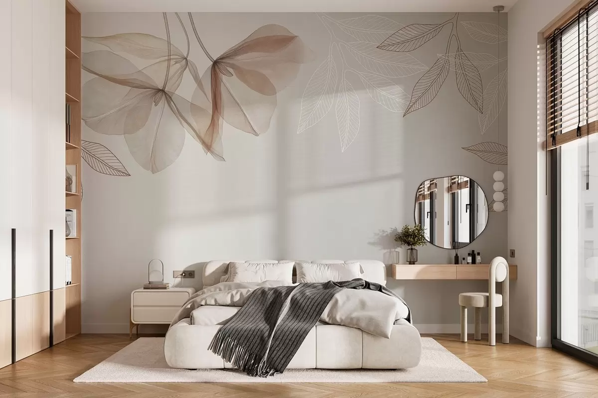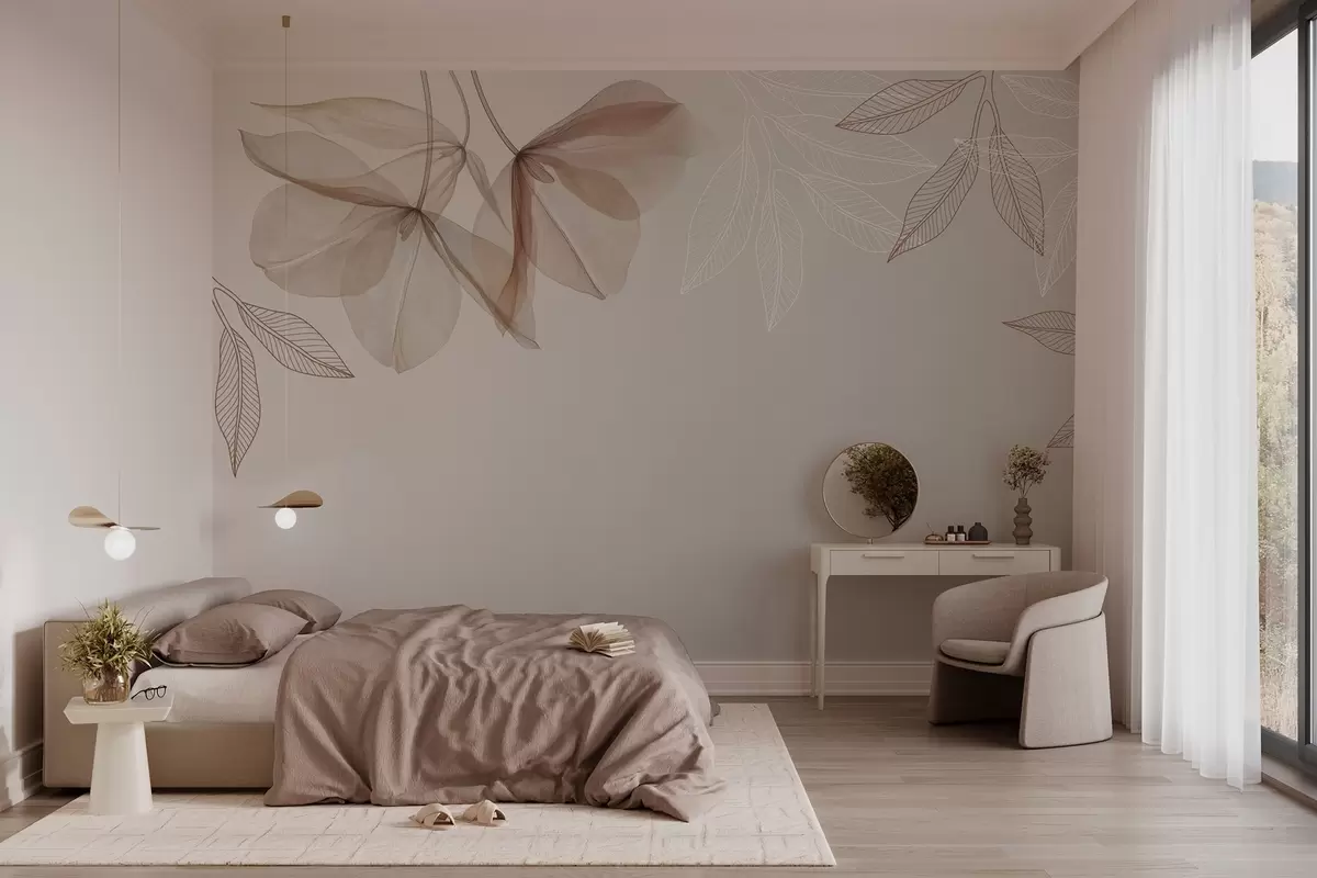 Papel tapiz delicadas flores y hojas translúcidas en tonos moca Nr. w03616v3