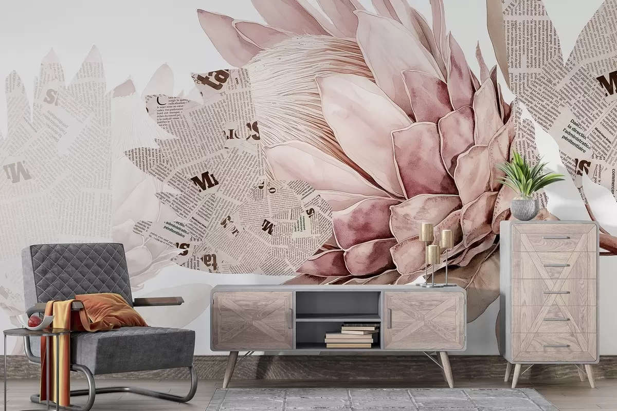 Papel tapiz Flores de protea, arte periodístico, floral, tropical, colores beige pastel Nr. w03667v4